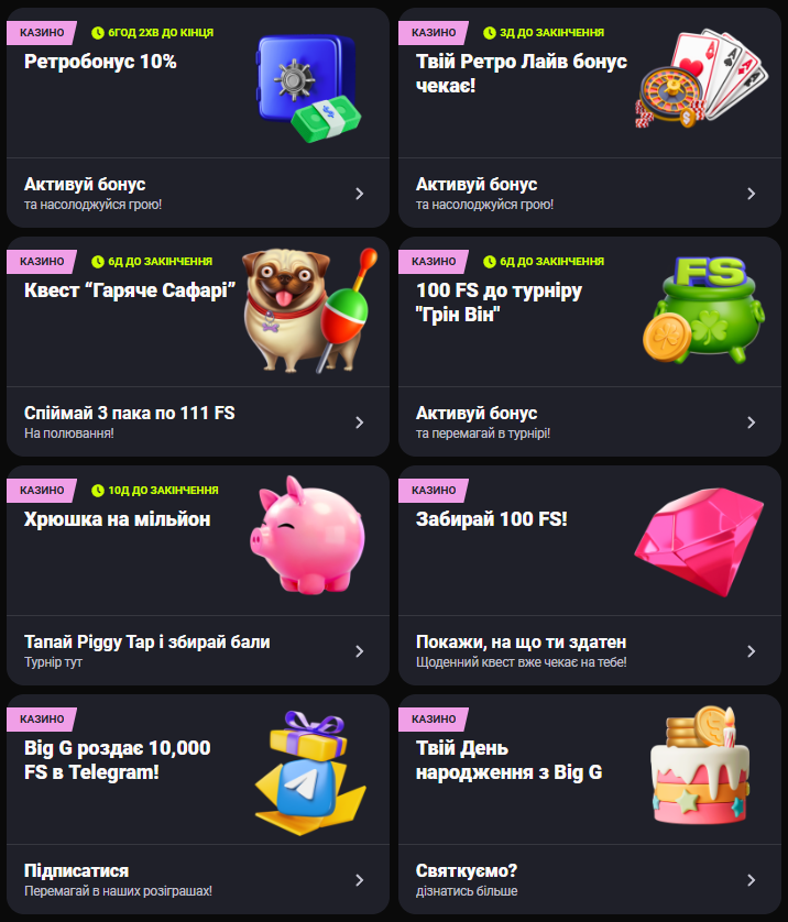 📅 Сезонні акції | Пропозиції, приурочені до свят або важливих подій, із збільшеними бонусами та призами. |